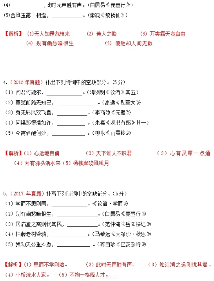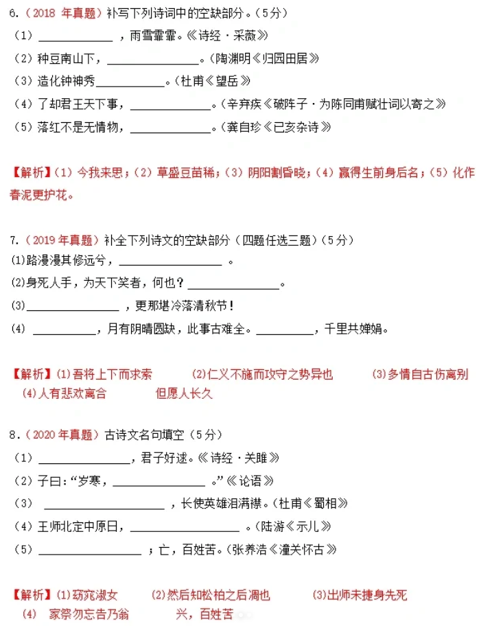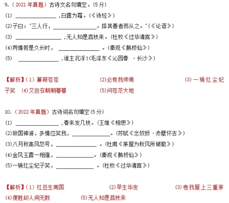 陜西高職單招考試歷年語(yǔ)文“古詩(shī)詞默寫”真題: