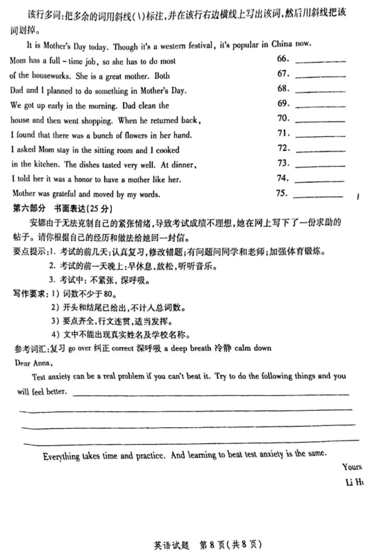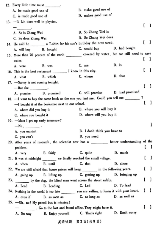 導讀:以下是陜西高職單招考試英語試題。陜西高職單招考試英語備考時每日必做的事情就是背單詞,鞏固復習單詞,運用單詞。然后就是刷閱讀理解、完形填空做題做多了是有套路的,總結規律。最后就是聽英語,多聽多讀,保持自己的語感!