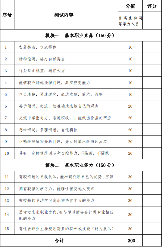 普通高中畢業生和高中同等學力人員職業適應性測試采取自我展示和問題回答相結合的方法,主要通過考生的自我介紹、回答問題等環節對學生的基本素養、學習能力及對財務會計類專業職業的認識來對考生的職業潛能進行整體的觀察、考核與評價,滿分分值為 300 分。