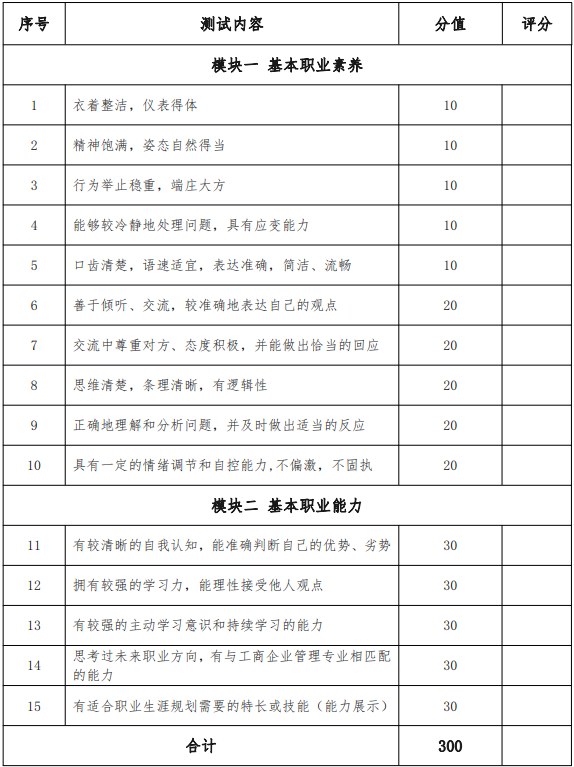 工商管理類(lèi) 1 類(lèi)職業(yè)適應(yīng)性(技能)測(cè)試采取面試操作方式進(jìn)行,普通高中畢業(yè)生和高中同等學(xué)力人員職業(yè)適應(yīng)性測(cè)試滿分值 300 分。