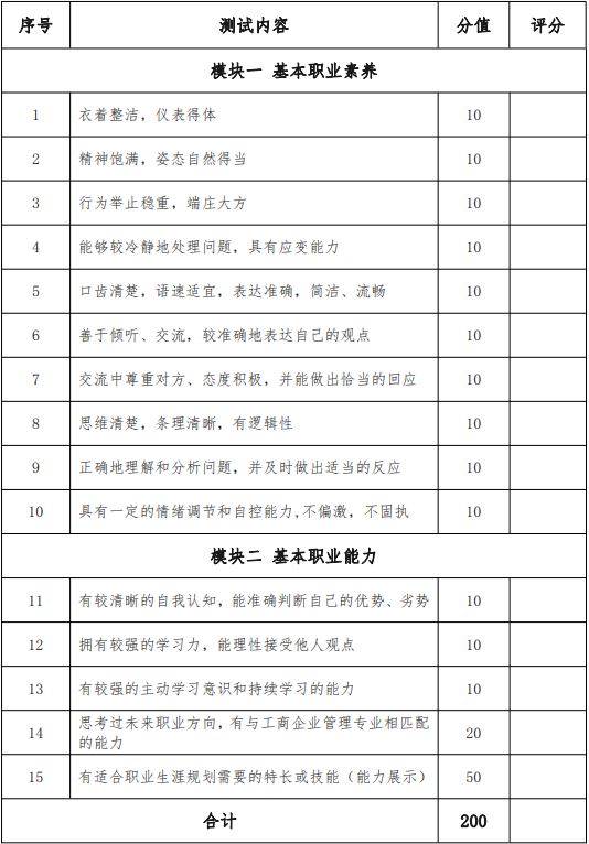 工商管理類(lèi) 1 類(lèi)職業(yè)適應(yīng)性(技能)測(cè)試采取面試操作方式進(jìn)行,“三校生”技術(shù)技能測(cè)試滿分值 200 分。
