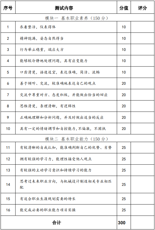 普通高中畢業生和高中同等學力人員職業適應性測試采取自我展示和問題回答相結合的方法,主要通過考生的自我介紹、回答問題等環節對學生的基本素養、學習能力及對電力技術類專業職業的認識來對考生的職業潛能進行整體的觀察、考核與評價,滿分值為 300 分。
