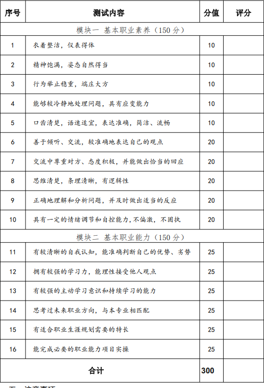 普通高中畢業生和高中同等學力人員職業適應性測試采取自我展示和問題回答相結合的方法,主要通過考生的自我介紹、回答問題等環節對學生的基本素養、學習能力及對電子信息類 1 專業職業的認識來對考生的職業潛能進行整體的觀察、考核與評價,滿分值為 300 分。