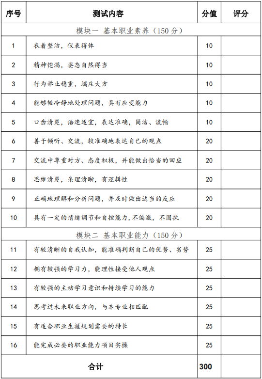 普通高中畢業生和高中同等學力人員職業適應性測試采取自我展示和問題回答相結合的方法,主要通過考生的自我介紹、回答問題等環節對學生的基本素養、學習能力及對電力技術類專業職業的認識來對考生的職業潛能進行整體的觀察、考核與評價,滿分值為 300 分。