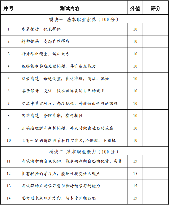 “三校生”技術技能測試采取自我展示、回答問題和完成實操相結合的方法,以教育部發布的中職專業教學標準中核心技術技能為基本依據,以操作考試為主,通過考察學生對崗位技能、通用技術等內容的職業潛能進行整體觀察、考核和評價,滿分值為 200 分。