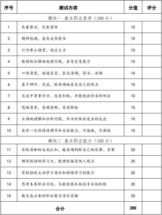 “三校生”技術技能測試采取自我展示和問題回答相結合的方法,主要通過考生的自我介紹、回答問題等環節對學生的基本素養、學習能力及對數控技術、工業設計專業職業的認識來對考生的職業潛能進行整體的觀察、考核與評價,滿分值為 200 分。
