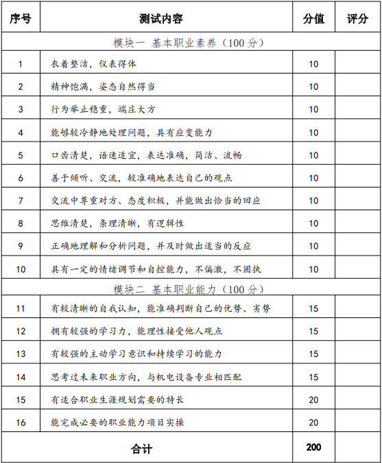 普通高中畢業生和高中同等學歷人員職業適應性測試采取自我展示和問題回答相結合的方法,主要通過考生的自我介紹、回答問題等環節對學生的基本素養、學習能力及對機電設備類 1 專業職業的認識來對考生的職業潛能進行整體的觀察、考核與評價,滿分值為 300 分。