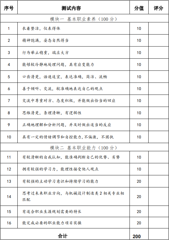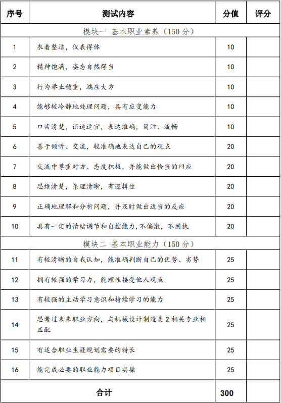 普通高中畢業生和高中同等學力職業適應性測試采取自我展示和問題回答相結合的方法,主要通過考生的自我介紹、回答問題等環節對學生的基本素養、學習能力及對機械設計制造類 2 專業職業的認識來對考生的職業潛能進行整體的觀察、考核與評價,滿分值為 300 分。