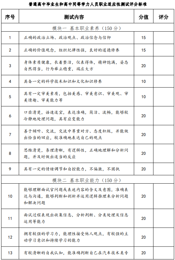 道路運輸類 2 專業職業適應性測試采取面試操作方式進行,其中普通高中畢業生和高中同等學力人員職業適應性測試滿分 300 分。