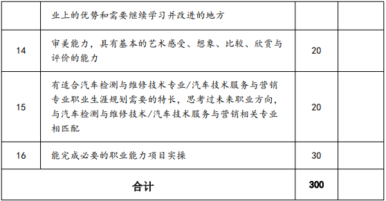 測試采取自我展示和問題回答相結合的方法,主要通過考生的自我介紹、回答問題等環節對學生的基本素養、學習能力及對道路運輸類汽車檢測與維修技術專業/汽車技術服務與營銷職業的認識來對考生的職業潛能進行整體的觀察、考核與評價。