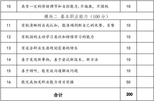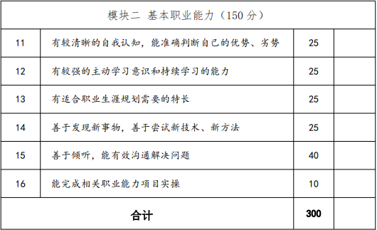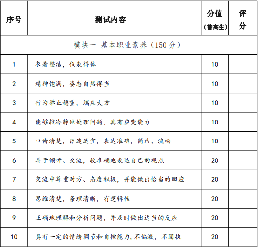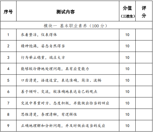 普通高中畢業和高中同等學力人員職業適應性測試考核重點為甄別普通高中畢業生和同等學力人員職業性向,引導考生合理選擇專業,促進考生按照自身興趣特長健康成長。主要考核社會適應能力、表達溝通能力、性格人格成長情況等方面,以評估面試者的職業素養水平,衡量滿足行業崗位標準和發展趨勢的面試者崗位操作成長潛力。測試時間控制在 15 分鐘,滿分300 分。