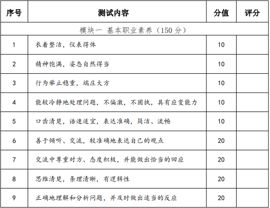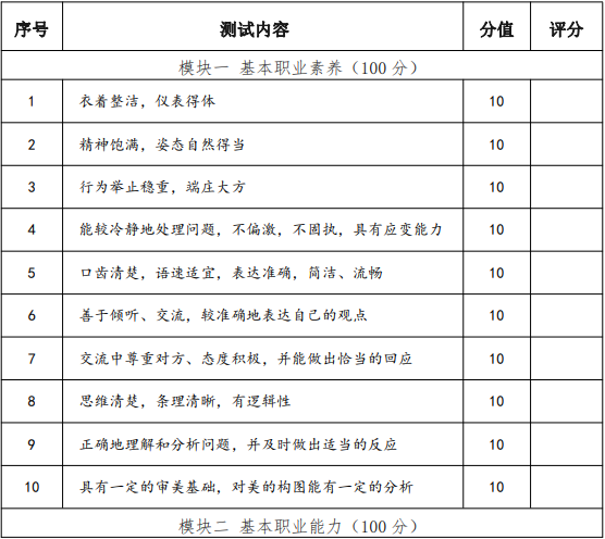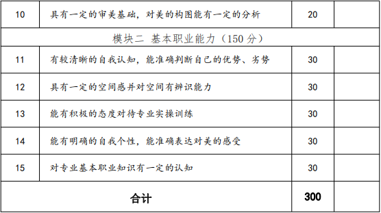 普通高中畢業和高中同等學力人員職業適應性測評考核重點為社會適應能力、表達溝通能力、性格人格成長情況等方面,以評估面試者的職業素養水平,及滿足行業崗位標準和發展趨勢的面試者崗位操作成長潛力。面試操作主要通過自我介紹、回答問題等環節對學生的基本素養、學習能力及對建筑室內設計類專業職業的認識來對考生的職業潛能進行整體的觀察、考核與評價,滿分分值為 300 分。