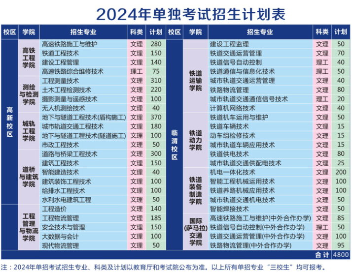 一、陜西鐵路工程職業技術學院2024年單獨考試招生計劃表: