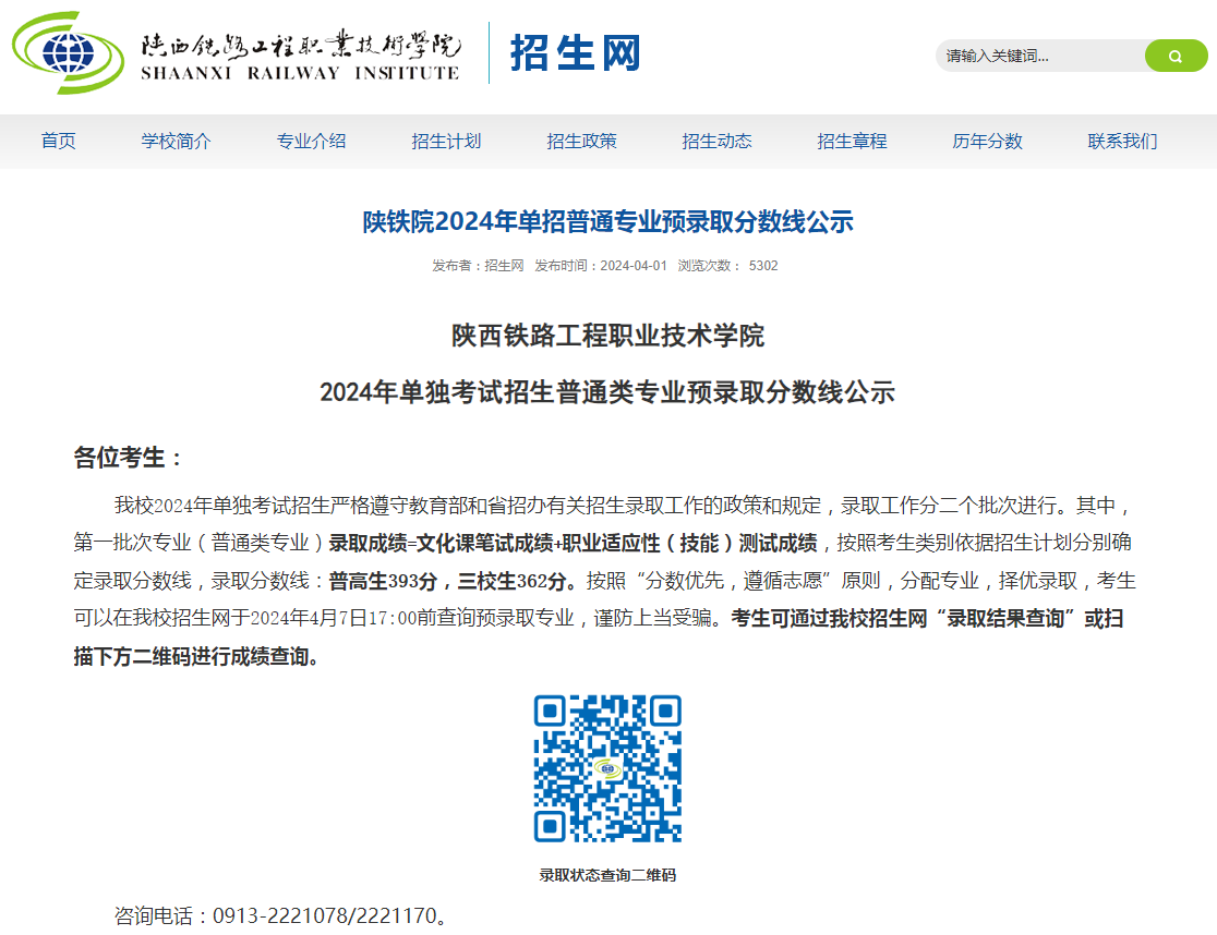 陜西鐵路工程職業(yè)技術(shù)學院2024年單獨考試招生普通類專業(yè)預錄取分數(shù)線公示: