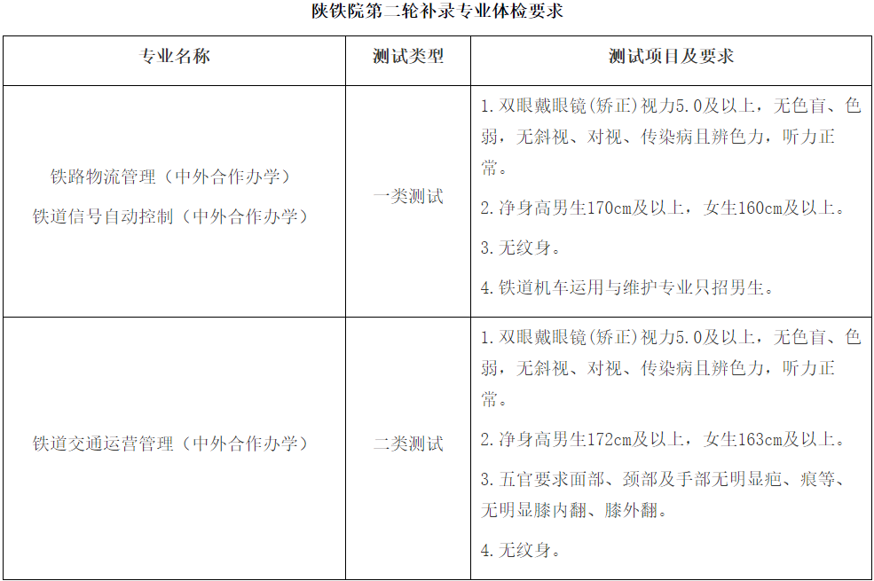 1.陜西鐵路工程職業技術學院第二輪遞補預錄取以體檢結果和考試成績為依據進行錄取,不再組織面試。第二輪補錄專業體檢要求見下表。
