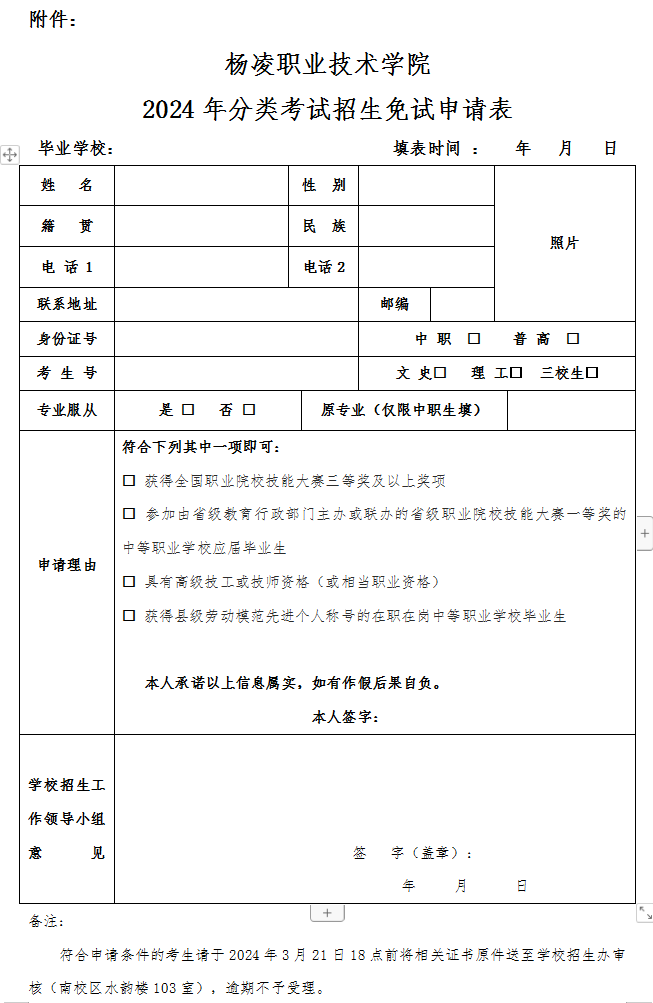 提交材料:凡符合免試錄取的考生即日起至3月21日18時,將《楊凌職業技術學院2024年分類考試招生(???免試申請表》、考生身份證復印件、相關證書原件交至學校招生就業處。