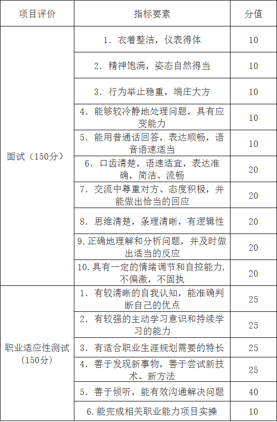 6)職業素養,包括本專業應具備的科學嚴謹、廉潔自律、細致耐心的職業素養。重點考察考生的職業興趣、職業性格、職業價值觀、職業能力傾向等方面與報考專業(職業)的匹配程度。