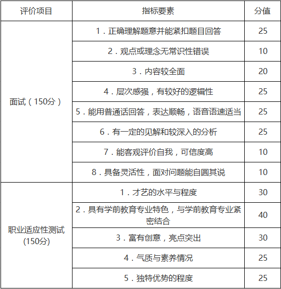 面試主要考察考生的文化知識素養、語言表達能力、溝通交流能力、邏輯思維能力、應變能力、以及對學前教育專業的認知。職業適應性測試包括形體項目、才藝項目(美術、音樂、舞蹈、講故事、朗誦等),主要考察考生的學習條件與基礎。形體項目重點考察考生的身體條件是否符合幼兒教師的基本要求,才藝項目重點考察考生學習彈、唱、跳、說、畫等專業技能的基礎。