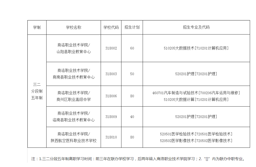 商洛職業技術學院2023年三二分段制五年制高職招生計劃及專業