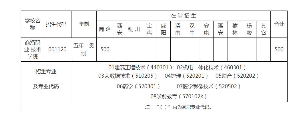 商洛職業技術學院2023年五年一貫制高職招生計劃及專業