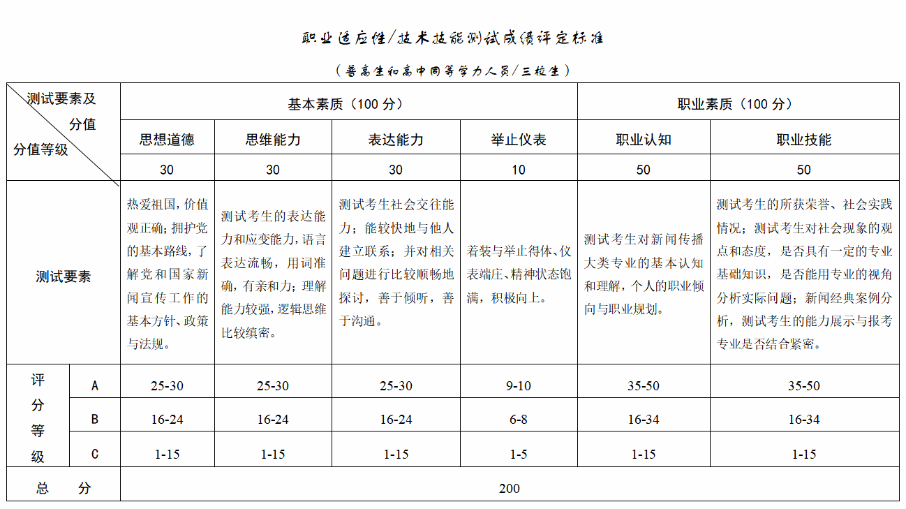 普高生和高中同等學力人員測試職業適應性,總分為200分,其中基本素質占100分,職業素質占100分,采用面試形式,測試時間為8分鐘以內(包括準備時間)。