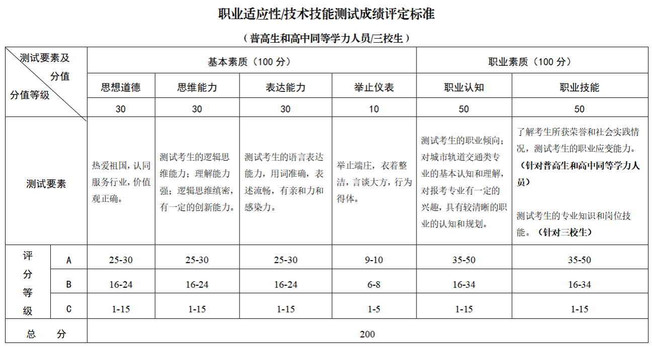 職業適應性和技術技能測試(面試)在于考察學生綜合運用高中(中職)階段所學知識和技能的基本情況。測試學生是否適應城市軌道交通類專業的學習,并具備相關專業學習基礎和學習能力;測試學生學習意向、儀表儀態、思辨能力、心理素質、溝通能力、應變能力等方面的綜合素質;對于專業與職業的認知和理解,職業性格與報考專業(職業)的匹配程度;是否具備良好的職業道德和職業素養。