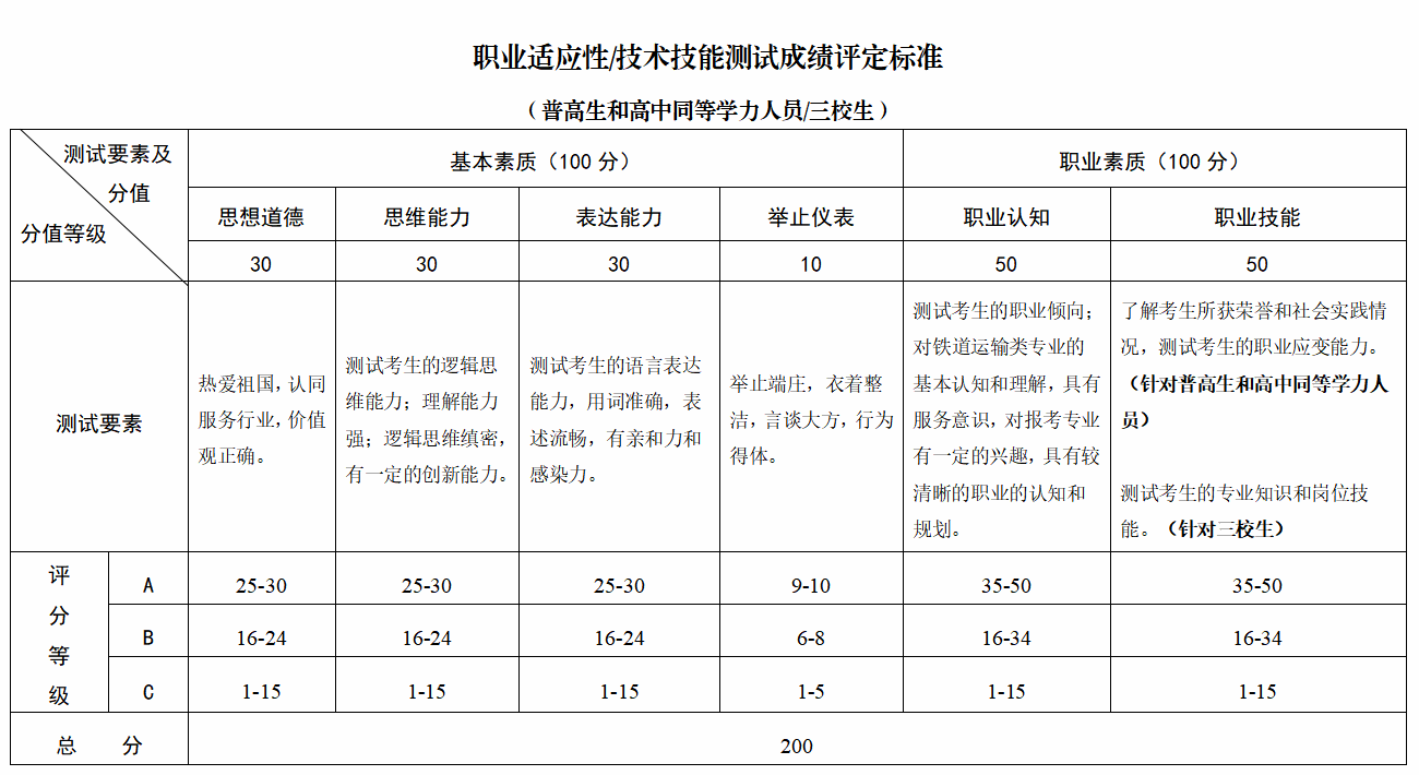 普高生和高中同等學力人員測試職業適應性,總分為200分,其中基本素質占100分,職業素質占100分,采用面試形式,測試時間為10分鐘以內(包括準備時間)。
