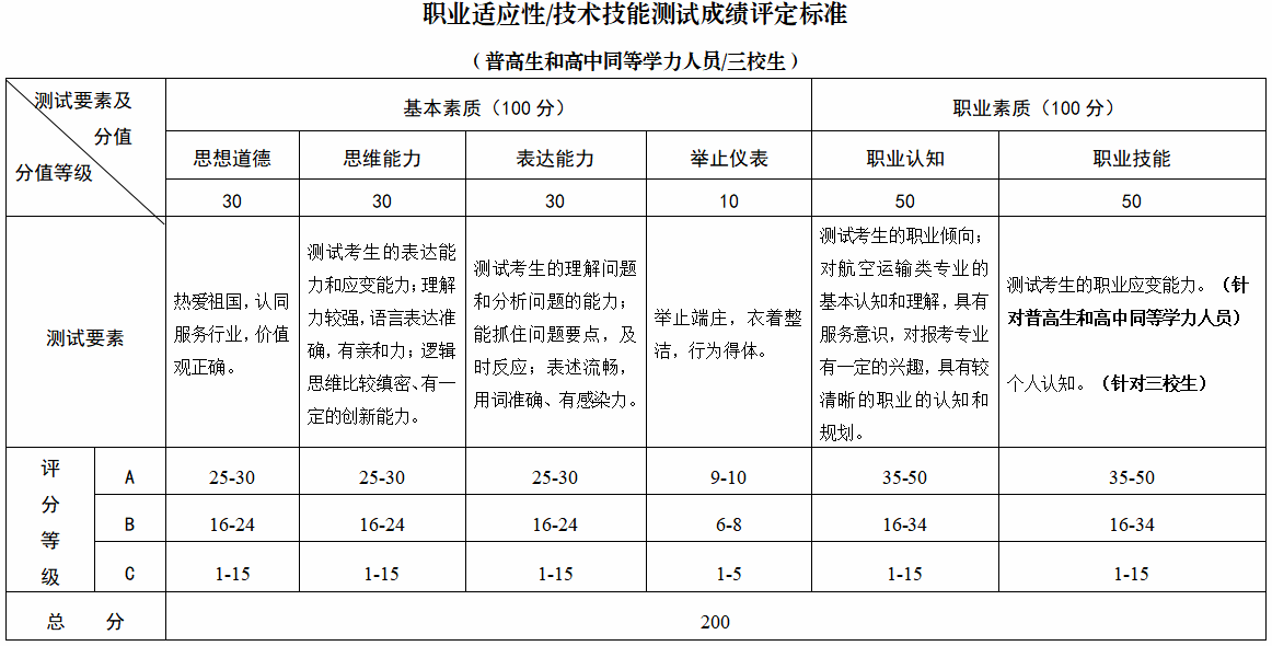 陜西青年職業(yè)學院2024年航空運輸類分類考試招生職業(yè)適應性和職業(yè)技能測試標準:
