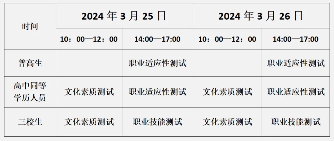 “普高生”使用高中學業水平考試成績,對“三校生”及其他不具有高中學業水平考試成績的考生,依據《中等職業學校公共基礎課課程標準》對其進行文化素質測試。 高中學業水平考試成績換算按照A=25分,B=20分,C=15分,D=10分規則,6科高中學業水平考試成績(不含通用技術)折算總成績為考生文化素質測試成績。 文化素質紙質測試滿分150分,考試時間為120分鐘,內容主要為語文、數學、英語三科綜合卷。 02.職業適應性(技能)測試